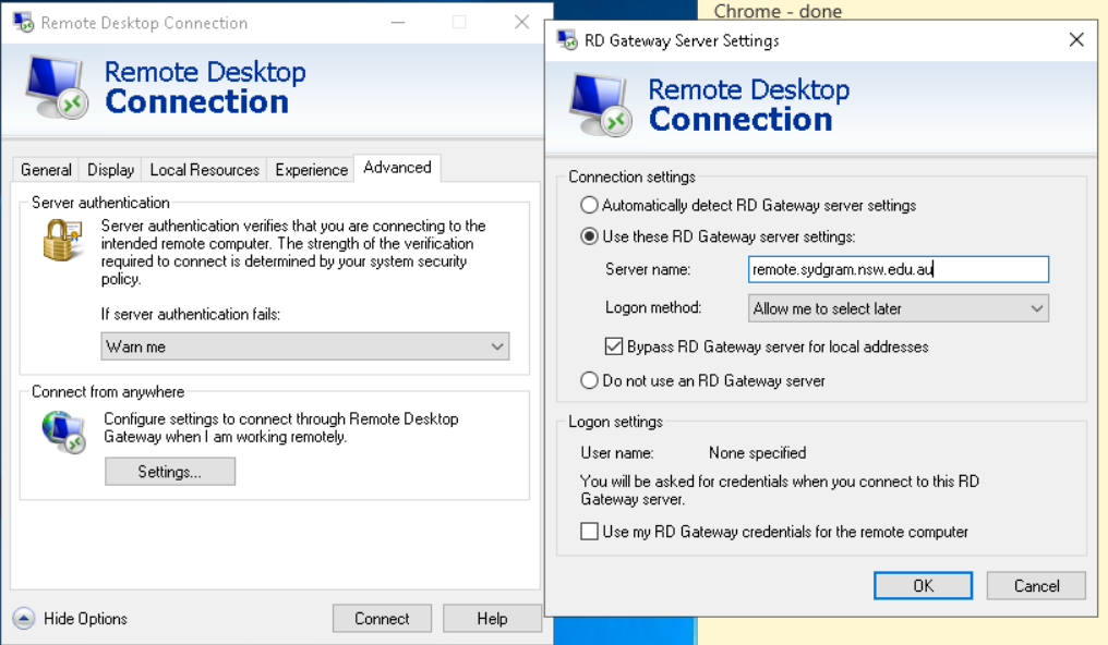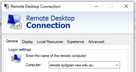 - Then click the “General” tab and type in the address remote.sydgram.nsw.edu.au and then click “Connect”