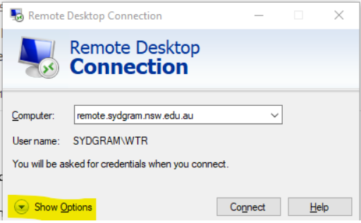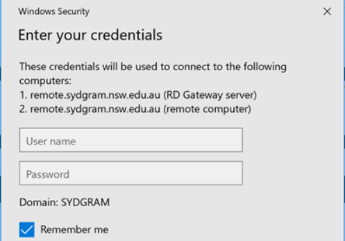 Use the Remote Desktop Connection and connect to remote.sydgram.nsw.edu.au