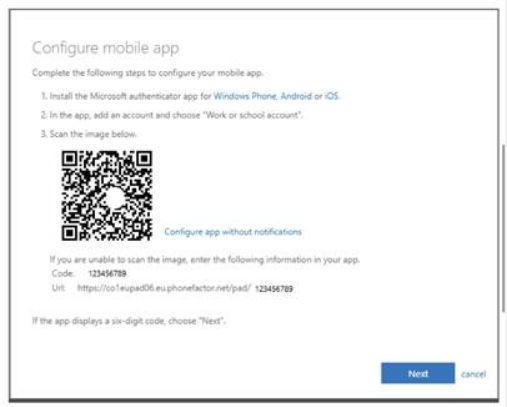 - Use the camera on your mobile device to scan the QR code displayed on your laptop/PC screen (do not scan the sample screen shot below) and a new profile will appear in the “Microsoft Authenticator” app.