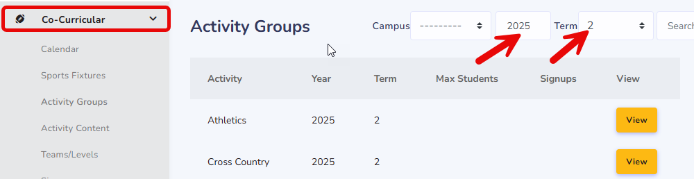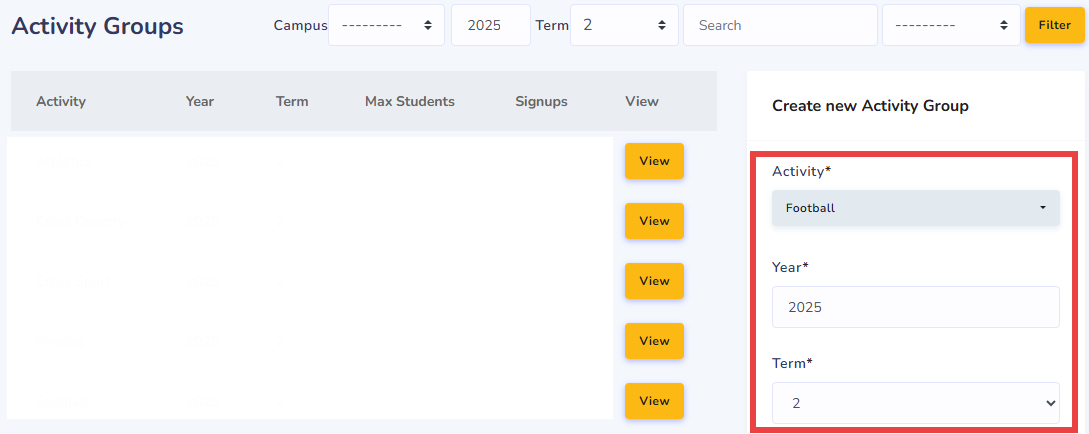 - If your Activity is not here, Create new Activity Group for the target Year and Term.