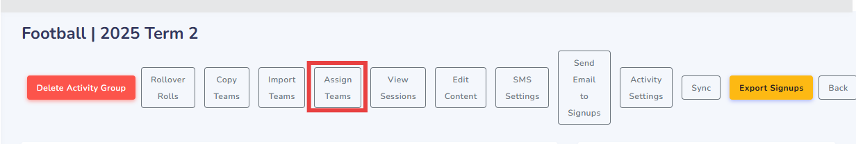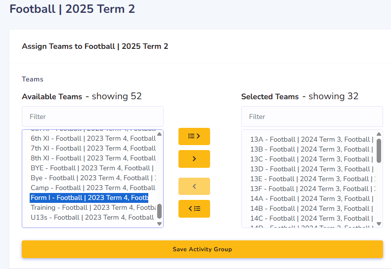 - Option 2: Use "Assign Teams" to find individual team created in previous year, then you can assign the team to this term using the ">" button in the middle, to transfer them to current year.