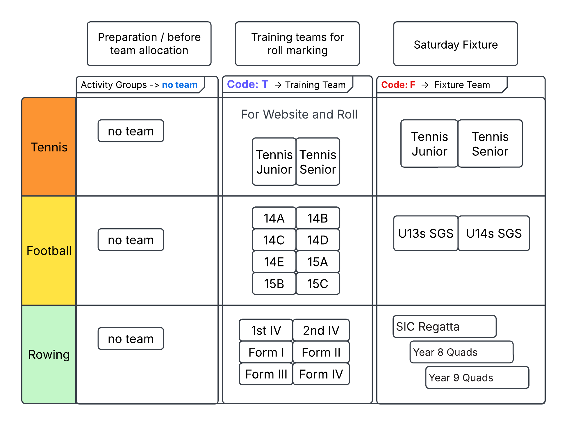 - Training Team (T) : Will Published on the Training section and these team will be use for schedule Roll marking.