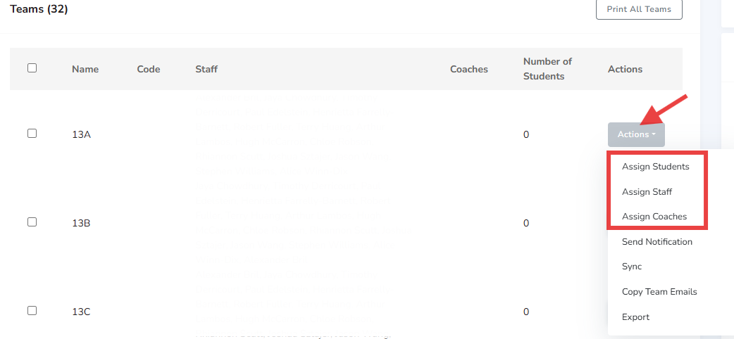 - Use "Actions" button at the end of the team to assign teachers and boys.
