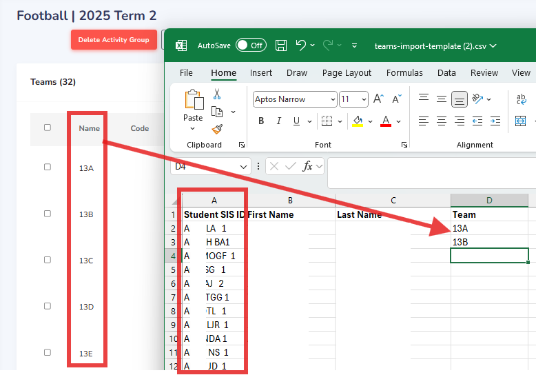- Column D Team name, this field must 100% match with the team name in the sports, with correct year and term. (no extra spaces in team name)