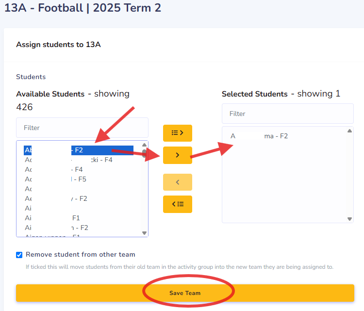 - Click "Assign Students", Search and Select the students in the list, click ">" button in the middle to move boys from left window to right "Selected Students" list, Click "Save Team" once finish. Then work through your team list to assign boys and staff.