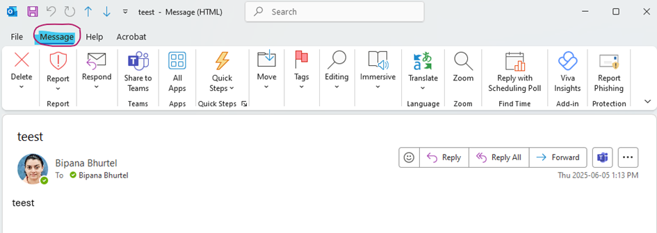 - In the opened email window, click on the Message tab in the ribbon