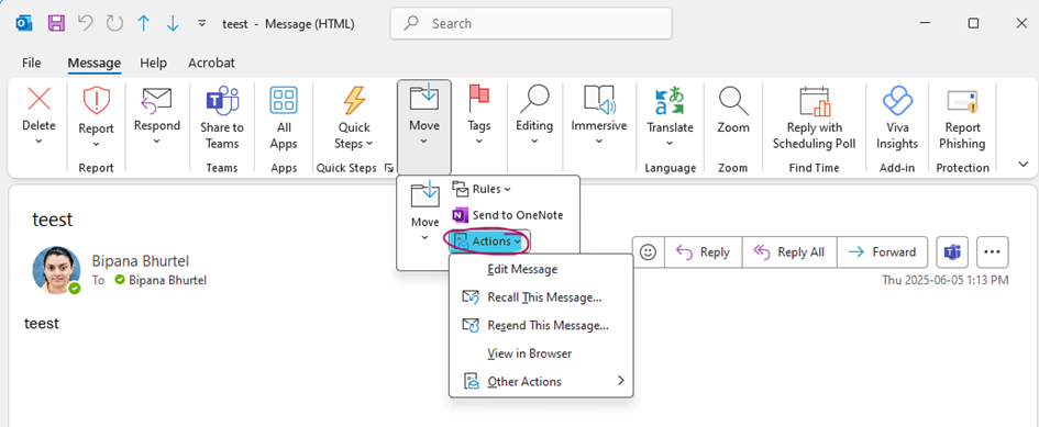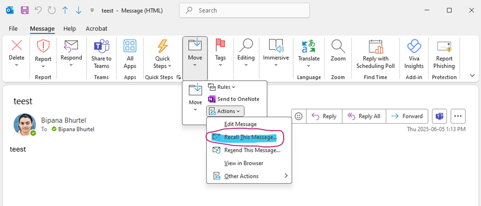 - Click on Recall This Message from the Actions menu