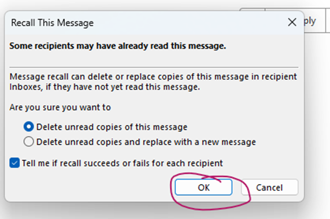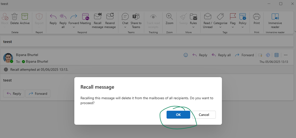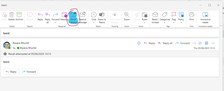 - Click on Recall message button (typically located in the toolbar)